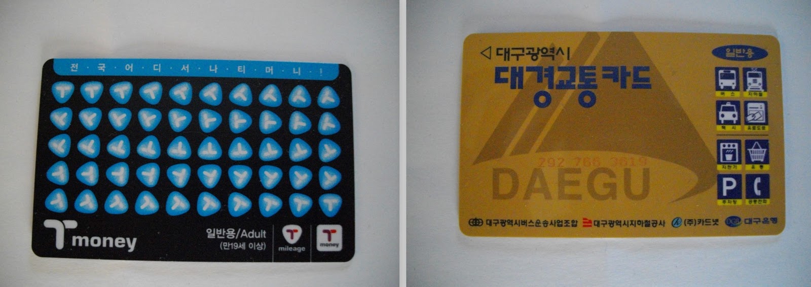 - Cost is about W1500 to use the subways. You can pay using a subway card or you can buy tokens form the automated token machines. Subway cards look like this: (I use the one on the left for Seoul and the one on the right for Daegu. You will see on the Daegu card that there are pictures - that shows you what other things the card can be used for.